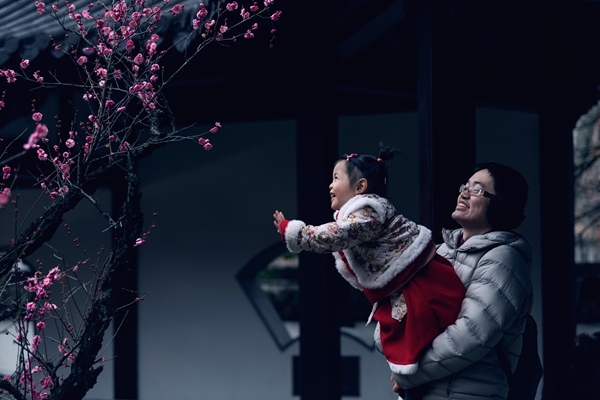 梅香溢庭园,稚子探春色。粉蕊缀枝,暗香浮动,孩童在亲人怀中伸手追向繁花,眉眼间满是对春日的欢喜。一长一幼,一花一笑,定格美好春光。(安徽省来安县纪委监委供 李桂芳 摄)