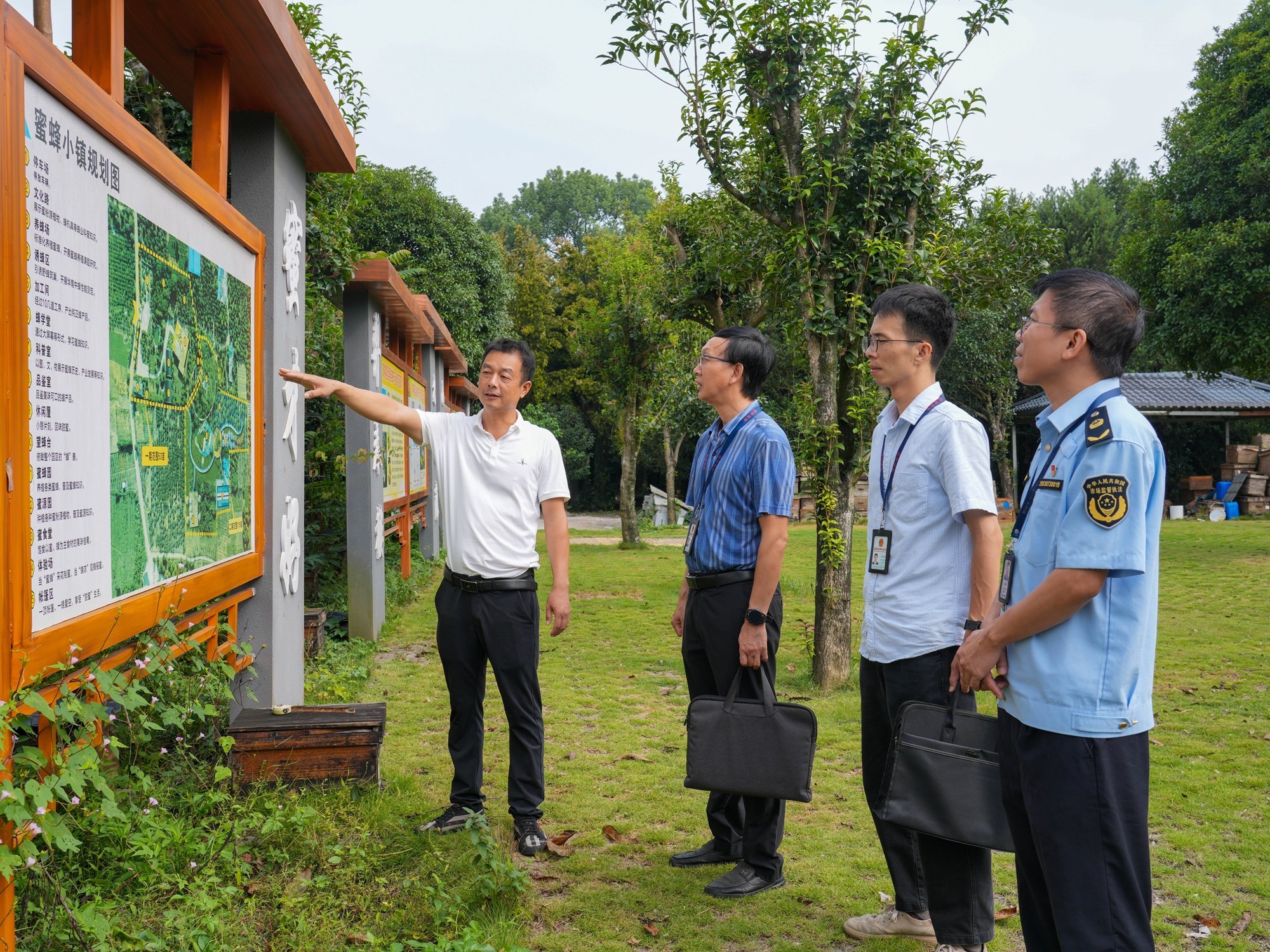 阳朔县纪委监委综合运用“师傅带徒弟”、“以老带新”等模式,组织年轻纪检监察干部到监督检查、审查调查一线学习锻炼,助力提高监督执纪执法水平。图为该县纪委监委业务骨干带领年轻纪检监察干部在养蜂基地走访了解情况。(阳朔县纪委监委供 唐凌霞/摄)