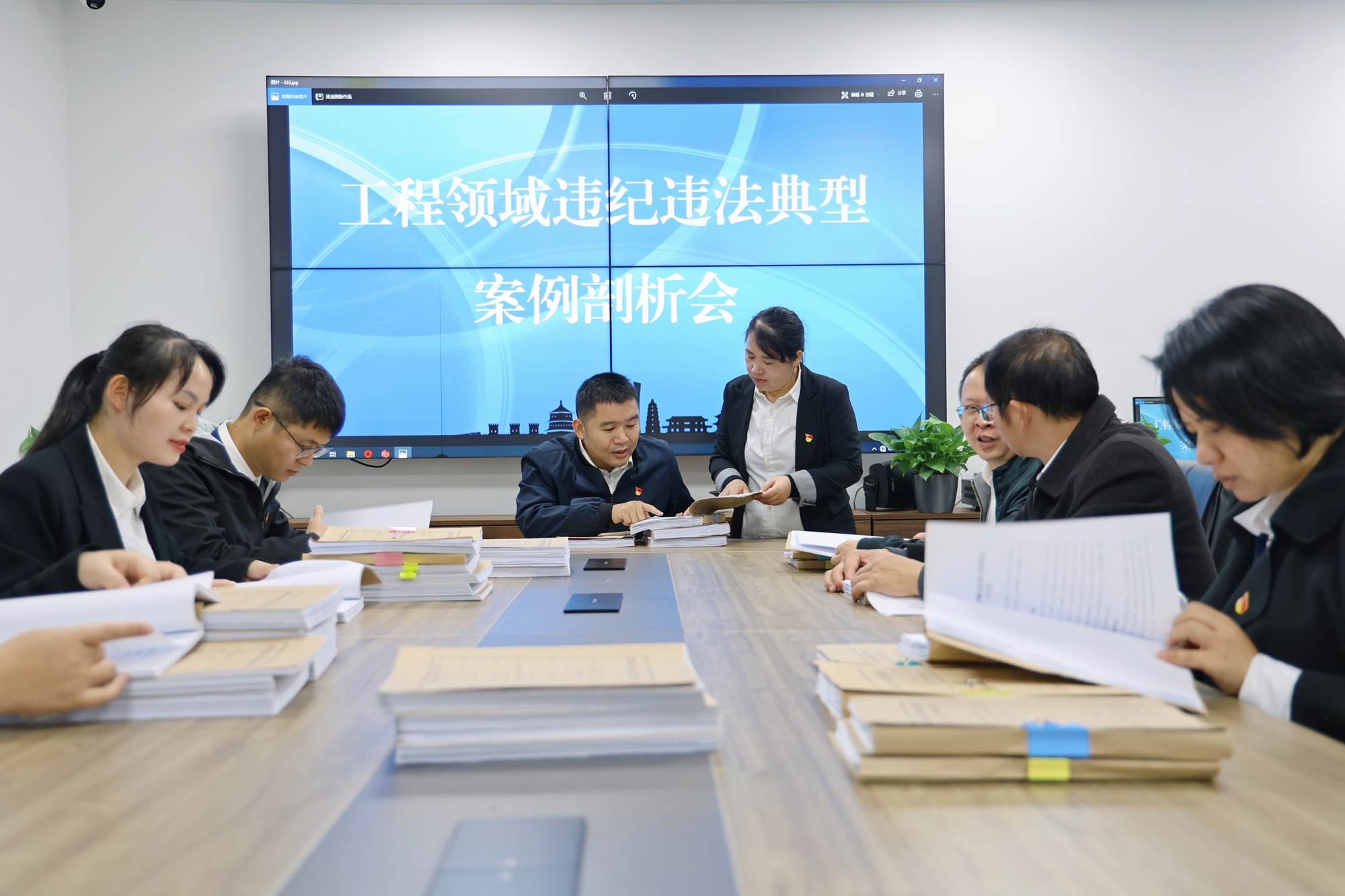 龙胜各族自治县纪委监委聚焦项目审批、招投标领域突出问题开展系统治理,严查项目审批环节的腐败问题,强化重大项目建设廉洁风险防控。图为该县纪检监察干部对工程领域违纪违法典型案例进行集中分析研判。(龙胜各族自治县纪委监委供 李群/摄)