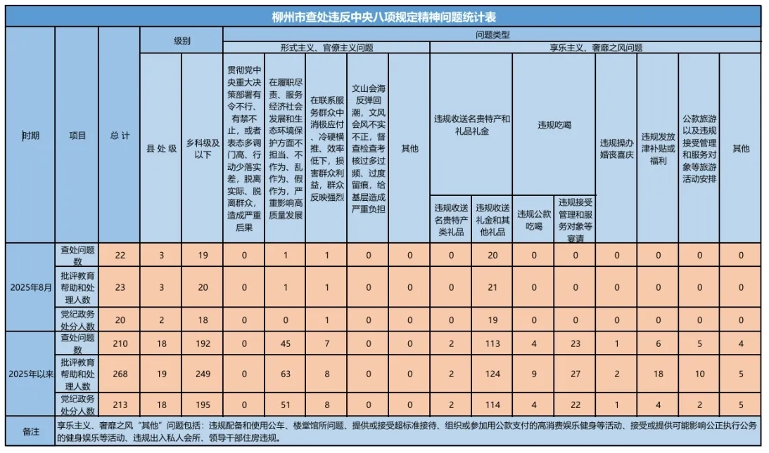 2025年1-8月全市查处违反中央八项规定精神问题210起