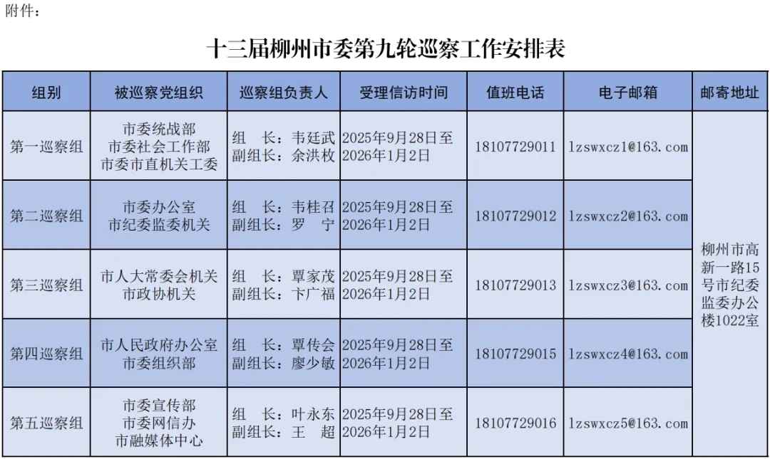 根据市委统一部署,2025年9月下旬至2026年1月上旬,开展十三届柳州市委第九轮巡察。现公告如下: