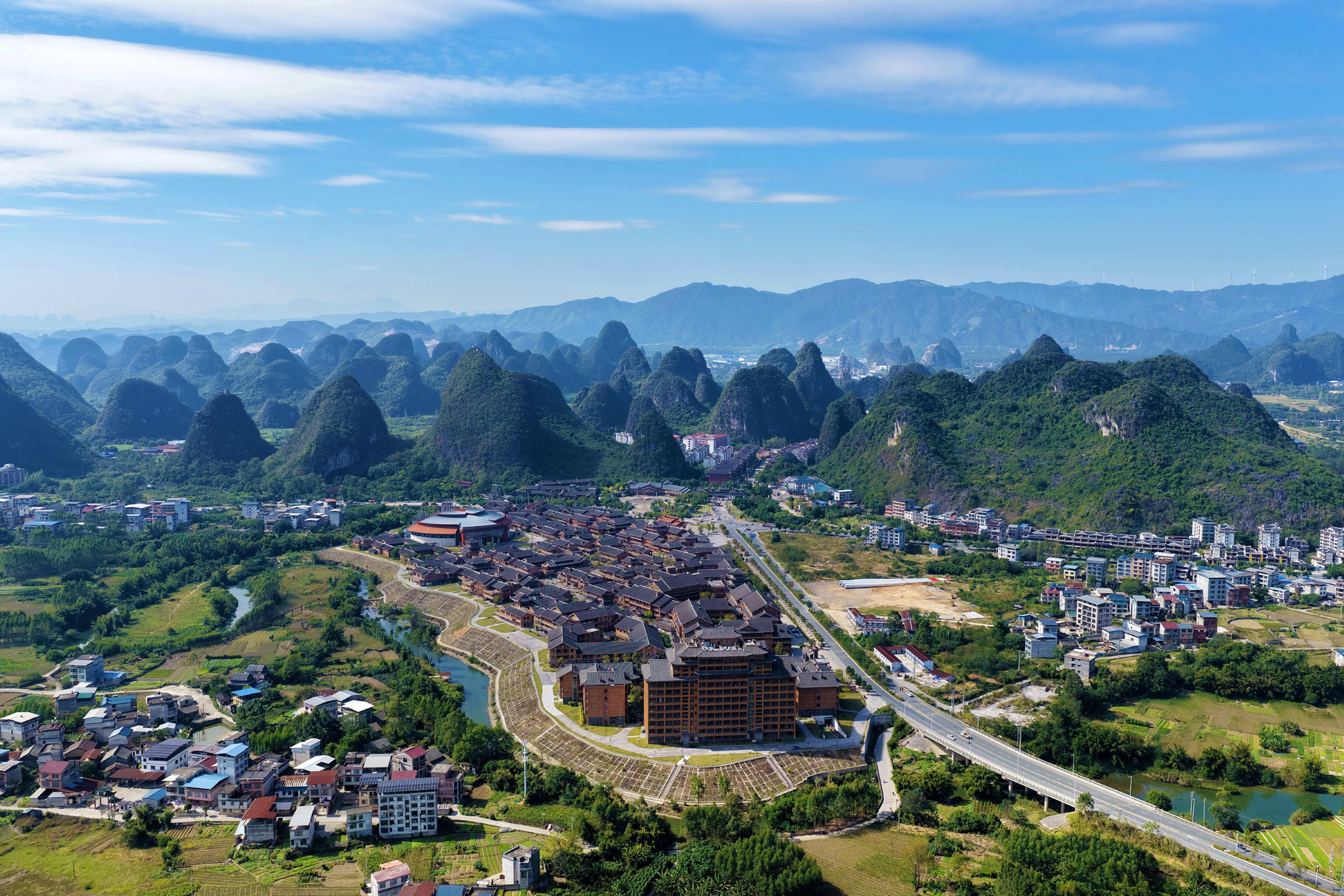 高天如洗映苗乡,江绕青山路带长。 融水苗族自治县融水镇苗家小镇云高气爽,蔚蓝的天空与公路、江河、青山、民居融为一体。(融水苗族自治县纪委监委供 龙林智/摄)