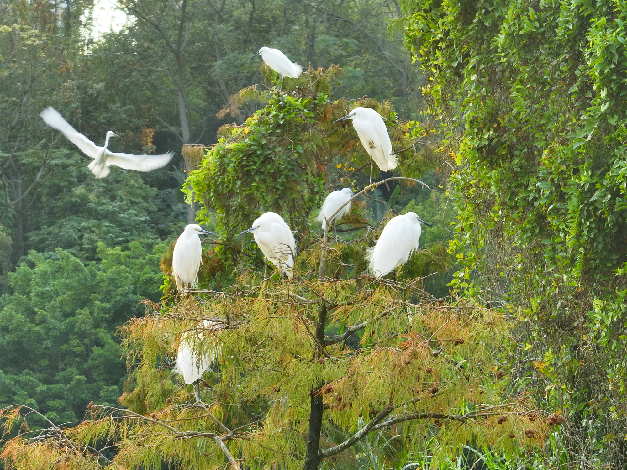 白鹭舞,冬景美。在梧州市玫瑰湖公园,成群南归过冬的白鹭正在公园内栖息、飞舞、觅食。(梧州市纪委监委供 林志清/摄)