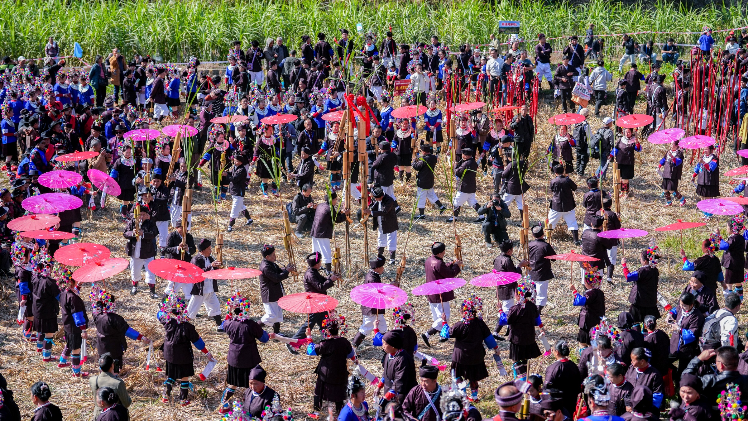冬至时节,在三江侗族自治县林溪镇,当地群众以民俗巡游、千人多耶、芦笙踩堂、侗族琵琶歌、抢花炮等丰富活动共庆传统花炮节,尽展侗乡多彩风情。(三江侗族自治县纪委监委供 吴练勋/摄)