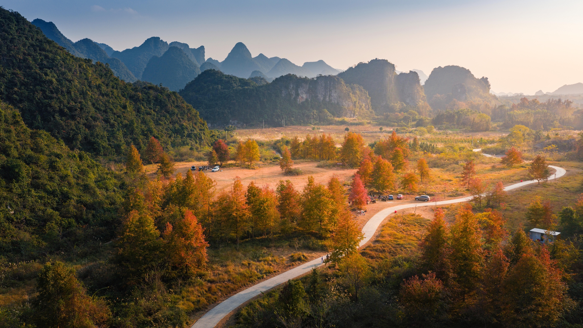 冬至时节,永福县百寿镇红枫谷迎来了最美的时刻,暖阳轻笼山野,红枫燃透层林,宛若铺展的朱砂长卷。(永福县纪委监委供 邱岗诚/摄)