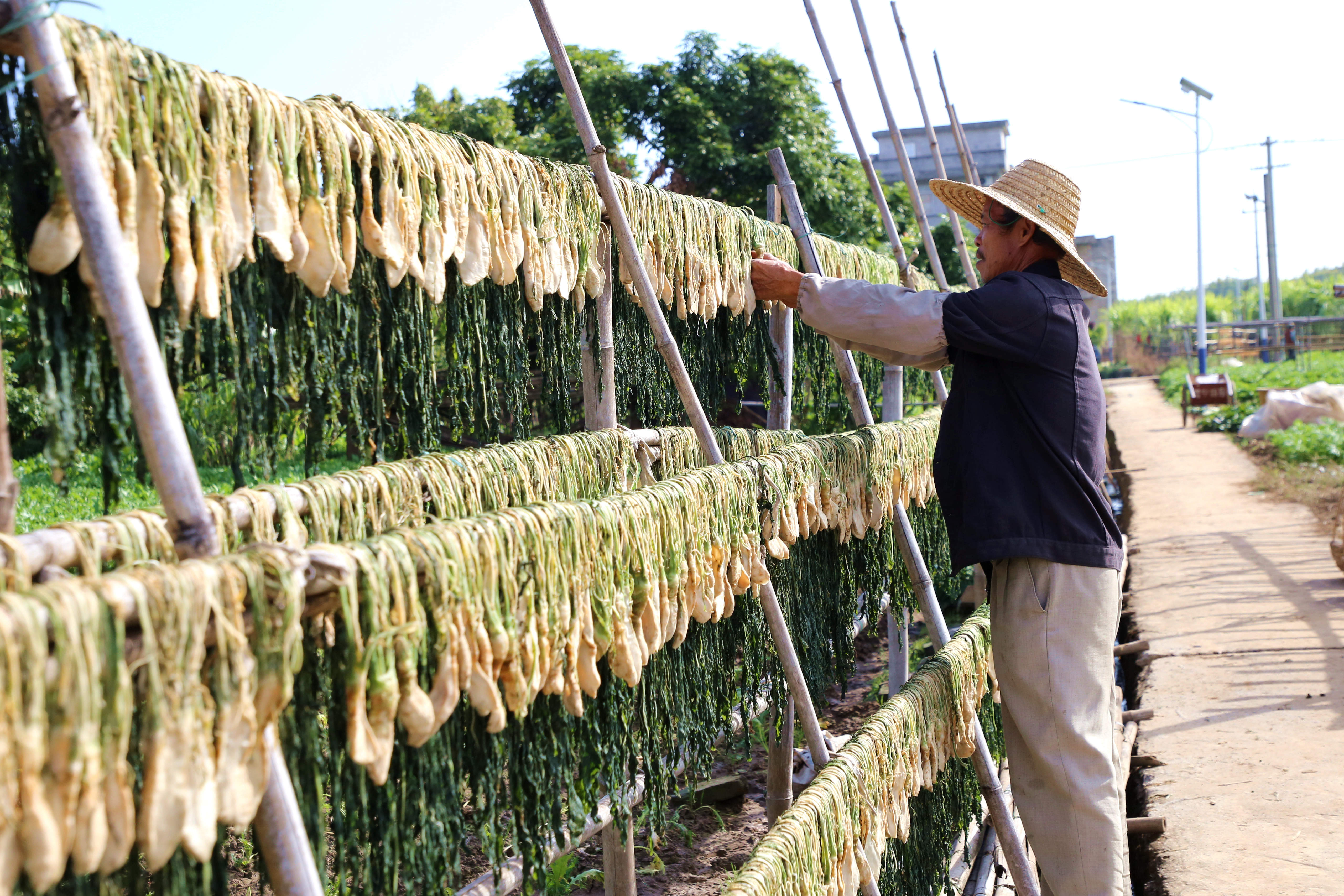 冬日寒风至,腌菜正当时。在藤县濛江镇党洲村,村民将刚采收的大头菜细细腌制妥当,一颗颗整齐地晾晒在竹竿上,空气中弥漫着一股清爽的咸香。(藤县纪委监委供 谢华婵/摄)