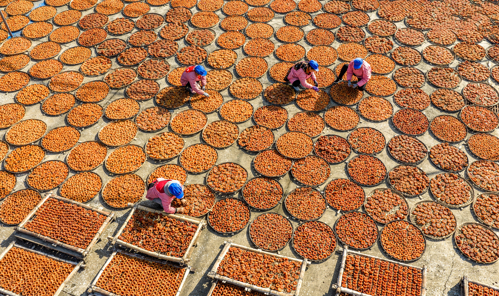 冬至日阳光明媚,在平乐县沙子镇维新村的晒场上,工人们正翻晒柿饼,橙红柿饼铺满竹匾,成为平乐特色农产品的甜蜜名片。(平乐县纪委监委供 杨宗盛/摄)