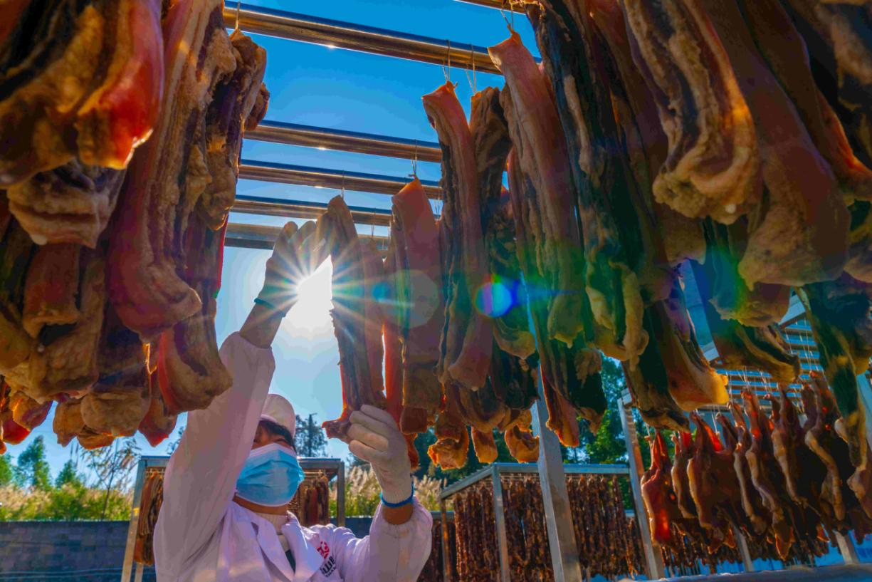 岁至冬至,年味初显,腊味制作迈入黄金时段。在金秀瑶族自治县桐木镇古池村,村民趁着晴好天气晾晒瑶家传统腊味。(来宾市纪委监委供 高如金/摄)