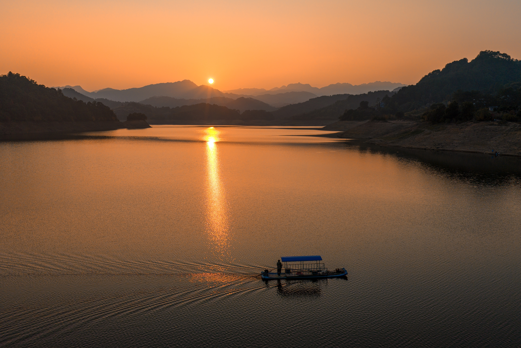 冬至日暮,荔浦花篢镇大江水库的落日熔金,将漫天云霞浸染为橘红绸缎。一叶轻舟犁开粼粼金波,青黛山影绰约倒映,舟行如笔,于天地间徐徐绘出一幅流动的水墨长卷,静谧而壮美。(阳朔县纪委监委供 夏立慧/摄)