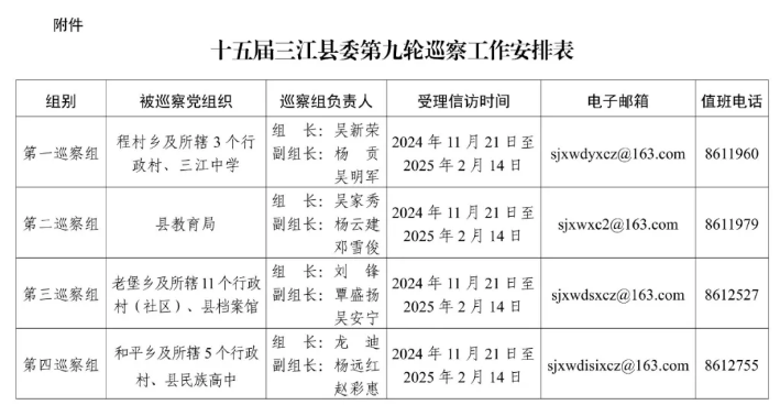 根据县委部署安排,2024年11月21日至2025年2月21日,开展十五届三江县委第九轮巡察工作。现公告如下: