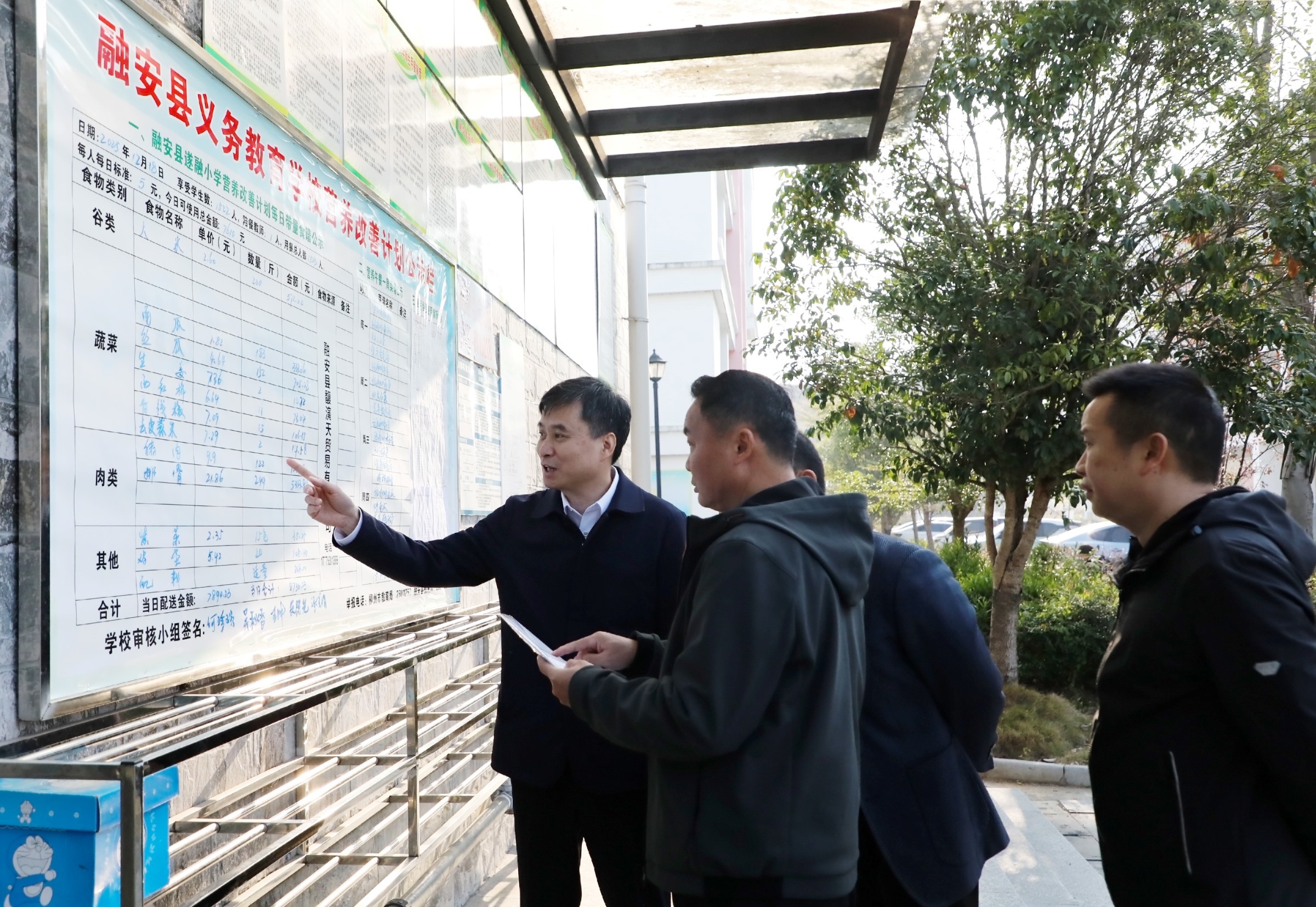 图为蔡立华(左一)在融安县遂融小学调研了解食材采购管理情况