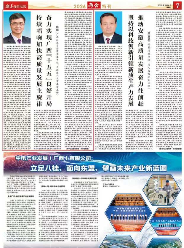立足面向东盟比较优势发展人工智能,强化高质量发展智能引领。人工智能时代,广西不能缺席、不能落后。但广西技术薄弱、人才短缺、资金不足,无法与发达地区拼数据拼算力拼算法,必须因地制宜、另辟蹊径,找准小切口,走差异化发展道路。广西打开门就是越南,走两步就到东盟,面向东盟的区位优势、平台优势、数字通道优势和小语种人才优势是广西核心竞争力,东盟国家也迫切希望搭上中国人工智能发展这趟快车。我们积极探索“北上广研发+广西集成+东盟应用”的发展路径,把国内顶尖的人工智能技术引进来,在广西进行本地化集成、场景化融合,把成熟的“人工智能+”解决方案推介到东盟国家去,高质量建设面向东盟的人工智能合作高地。去年9月,广西获批建设中国—东盟国家人工智能应用合作中心,全区人工智能发展纳入国家布局、取得先发优势。春节前夕,我们成功举办面向中国—东盟人工智能应用合作伦理安全座谈会和广西与越南五省市党委书记新春会晤,就持续深化人工智能合作达成重要共识。正月初八,广西代表团访问香港、澳门,成功签署人工智能等领域37项合作协议。2025年,全区人工智能核心产业产值突破800亿元。“十五五”时期,我们将更加注重策略、集成、应用、开放、安全,加快AI赋能千行百业,在服务国家、服务东盟中促进广西自身产业升级、实现高质量发展。