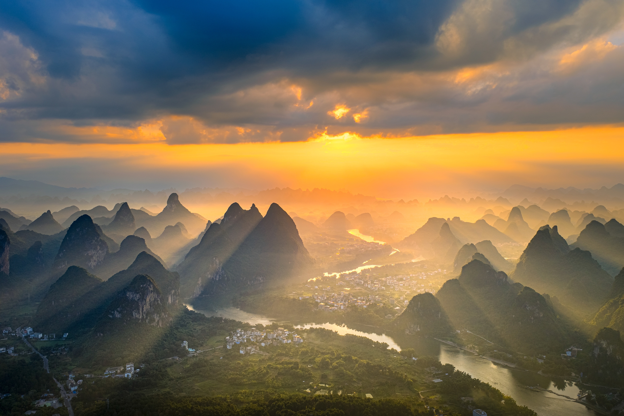 金秋时节,阳朔县漓江相公山,朝霞染红天空,喀斯特峰林轻雾缭绕,村庄、河流若隐若现,宛若仙境。(阳朔县纪委监委供 夏立慧/摄)