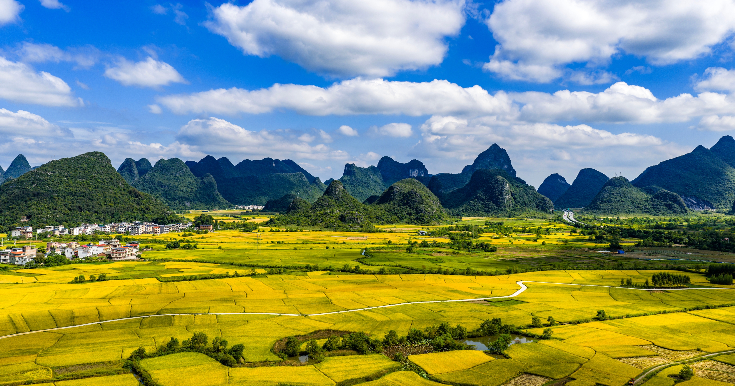 九月的广西,青黛喀斯特峰丛环抱着金黄稻田,漓江水泛着粼粼秋光,连风里都裹着桂花香与稻穗的清甜。