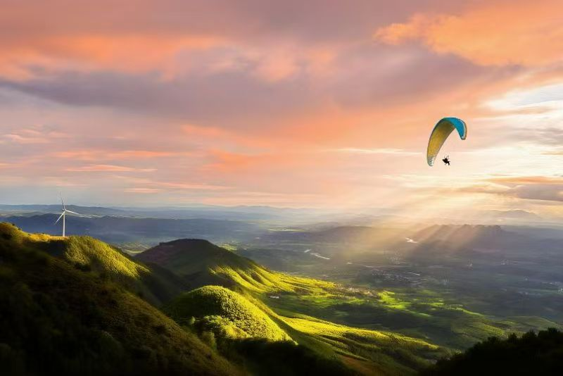 山间秋阳似火,万缕光芒洒下,连绵青山镀上金光。广西雷山大自然与人文风情共同绘就成一幅绝美画卷,草木繁茂,苍翠欲滴绿意仍浓,却又晕染出些许秋的深邃。滑翔伞如彩翼灵动,在天地间尽情舞蹈,尽享开阔与自由。风车在秋风中缓缓转动,似是在为这秋日盛景轻轻伴舞。(象州县纪委监委供 廖明俊/摄)