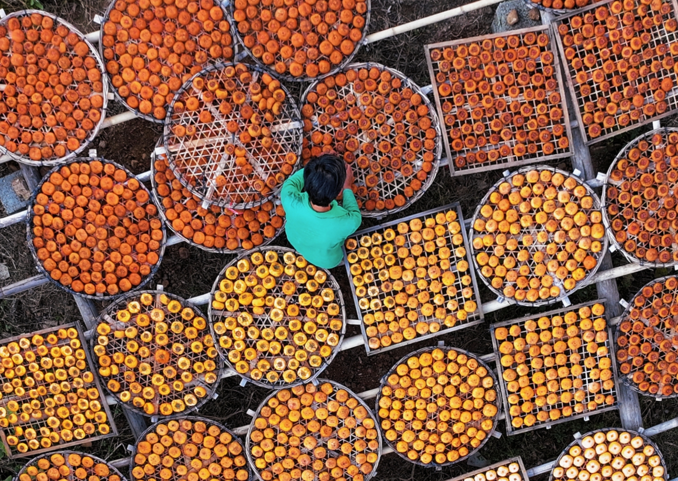 在恭城瑶族自治县,家家户户都忙着晒制柿饼,黄澄澄、金灿灿的柿子在屋顶上晾晒着,绘成了一幅冬日好“丰”景。(恭城瑶族自治县纪委监委供 费柳洁/摄)