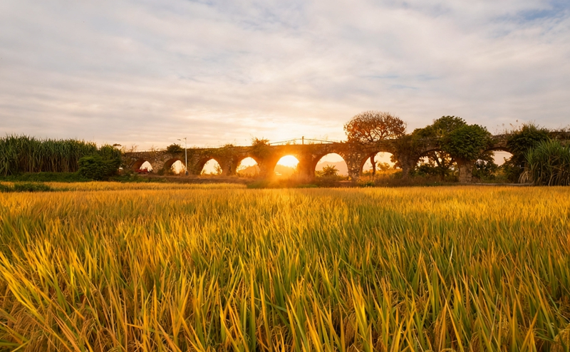 小雪时节,在崇左市江州区太平街道大村归龙屯,古桥映着落日余晖,在稻浪鎏金的田园间,晕染出一幅冬日时光美景。(崇左市纪委监委供 黎卫日/摄)