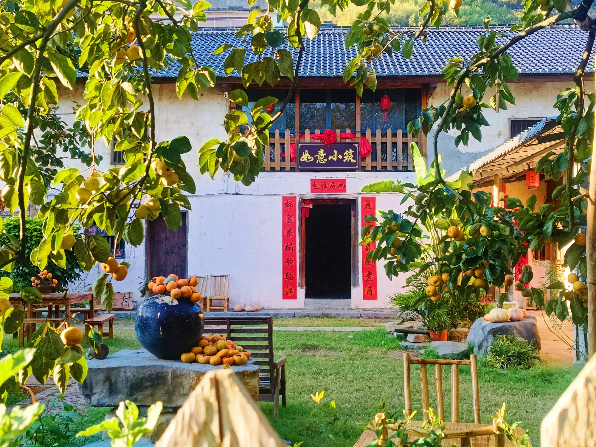 恭城瑶族自治县嘉会镇泗安村的如意小筑,阳光洒在院子里,满是柿子的甜香。枝头红柿饱满如灯,陶罐映着艳色,门楣“如意”与白墙黑瓦、朱红对联相映成趣。(恭城瑶族自治县纪委监委供 容道杰/摄)