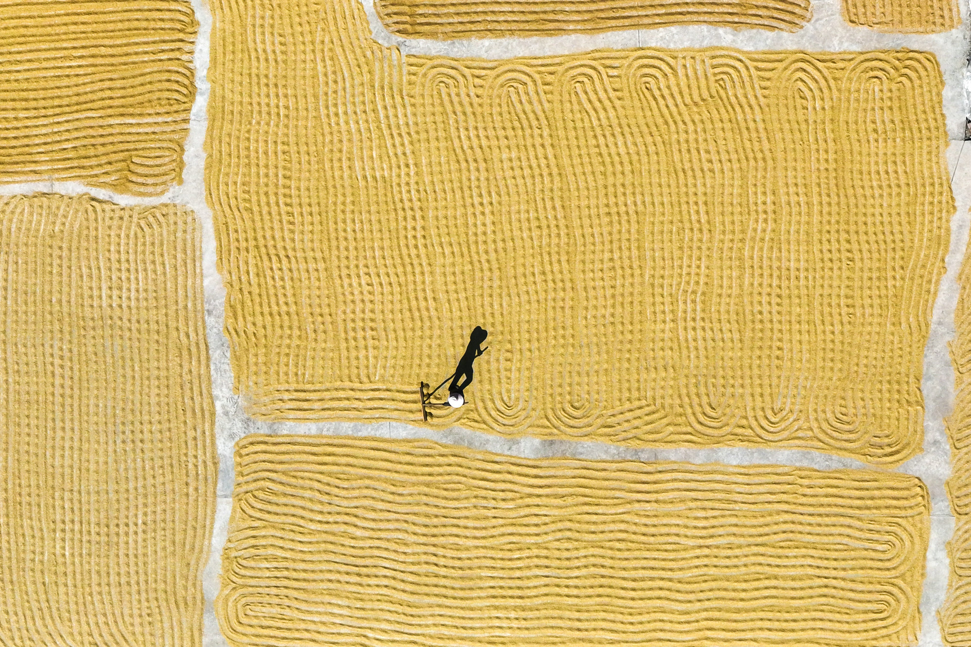 小雪时节,晚稻晾晒忙。从高空俯看梧州市蒙山县西河镇古排村的一处晒场,正在翻晒稻谷的农民与金黄的稻谷等构成一幅和美的丰收画卷。(梧州市纪委监委供 林志清/摄)