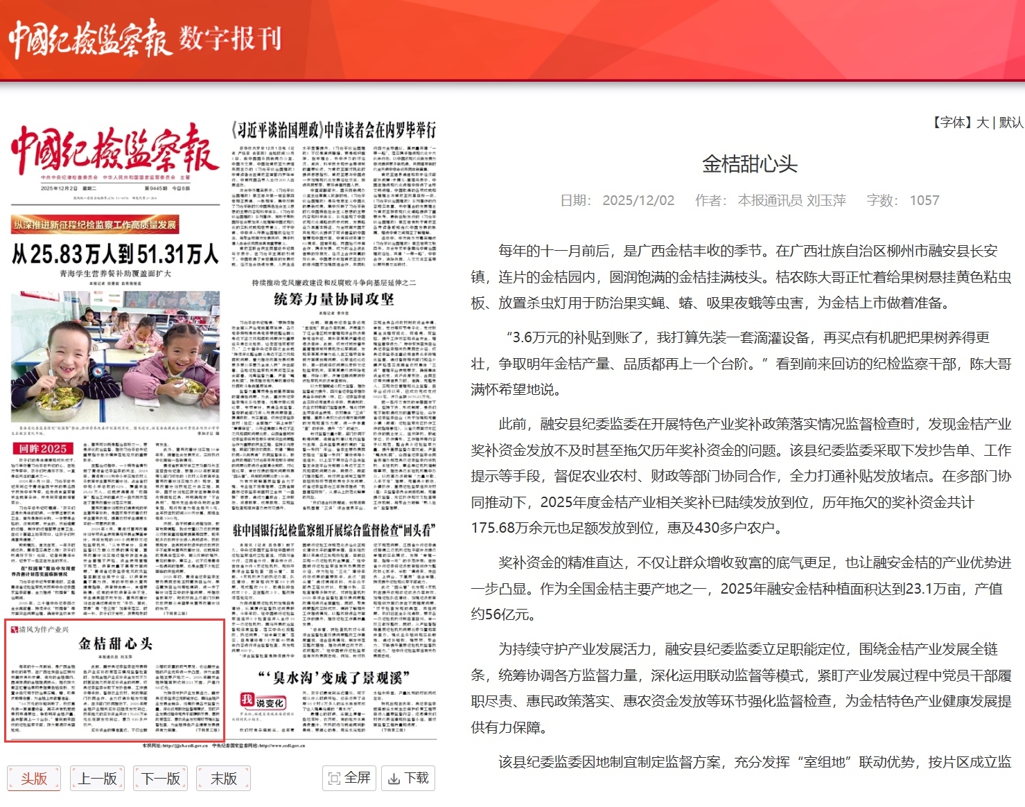 12月2日《中国纪检监察报》头版刊发《金桔甜心头》文章,介绍柳州市融安县纪委监委监督护航金桔特色产业健康发展的经验做法。
