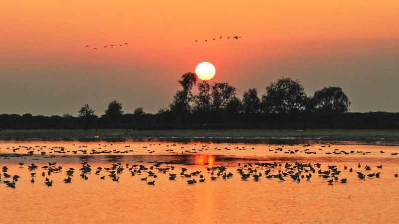 北海七星岛的暮空被晕染成橘红,粼粼波光缀满碎金,成群的候鸟与海鸭闲踱沙汀,宛若一幅温馨的冬日画卷。(北海市纪委监委供 吴泉/摄)