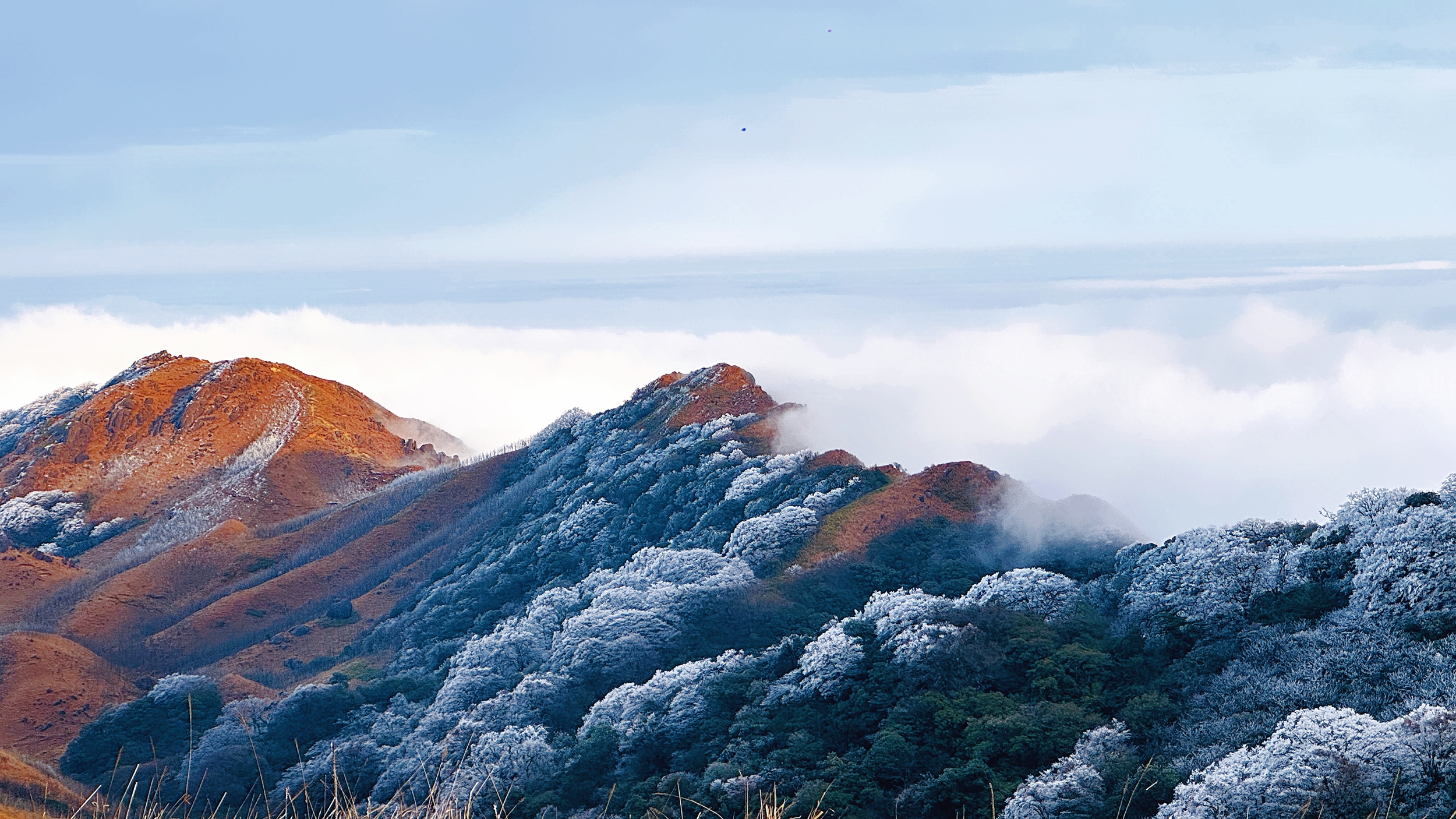 在全州天湖风景区,山峦裹上银装,云海翻涌间,橙红崖壁与琼枝相映,凛冬里藏着壮美的诗意。(全州县纪委监委供 谢永欣/摄)