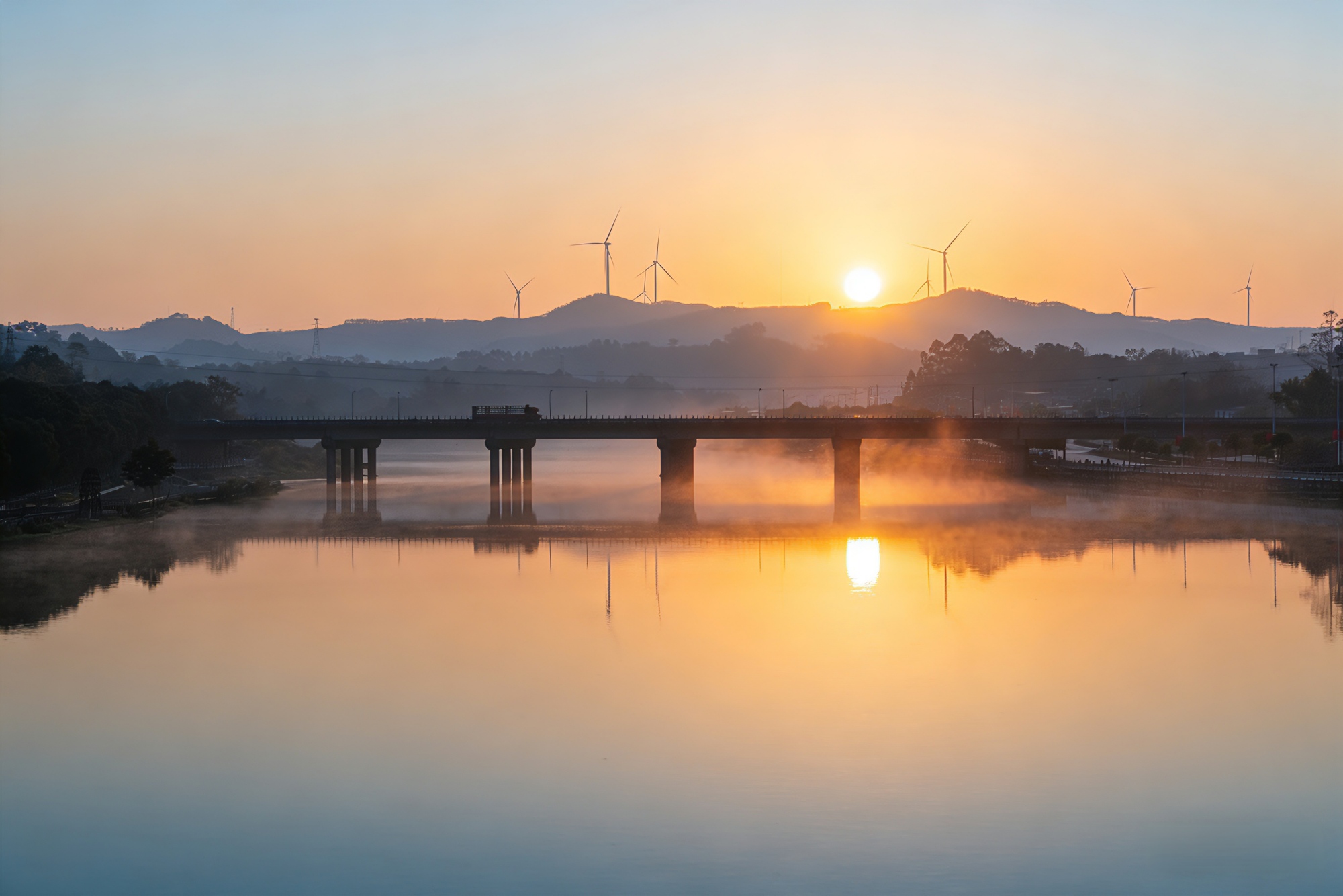 岁首一月,北流市圭江大桥被薄纱般的晨雾轻笼,朝阳跃过山峦,金辉洒遍圭江水面,晕染出壮乡冬日的山水灵韵。(北流市纪委监委供 李家辉/摄)