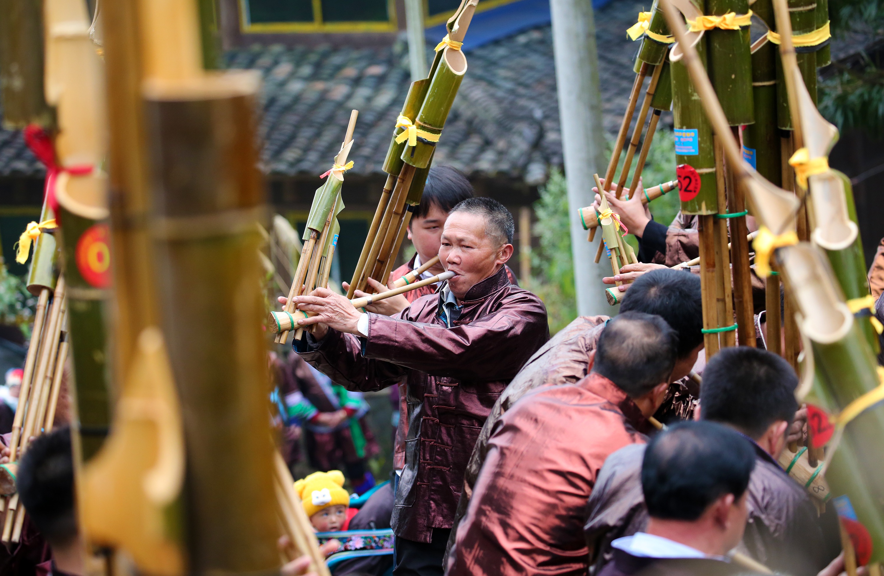 立春近,祈丰年。广西壮族自治区融水苗族自治县举办传统苗年活动,苗族同胞身着节日盛装,欢聚一堂,吹芦笙、跳苗笙、拔河,以原汁原味的民俗活动,祈求风调雨顺、五谷丰登。图为该县杆洞乡锦洞苗寨的苗族群众在吹奏芦笙(广西壮族自治区融水苗族自治县纪委监委供 龙林智 摄)