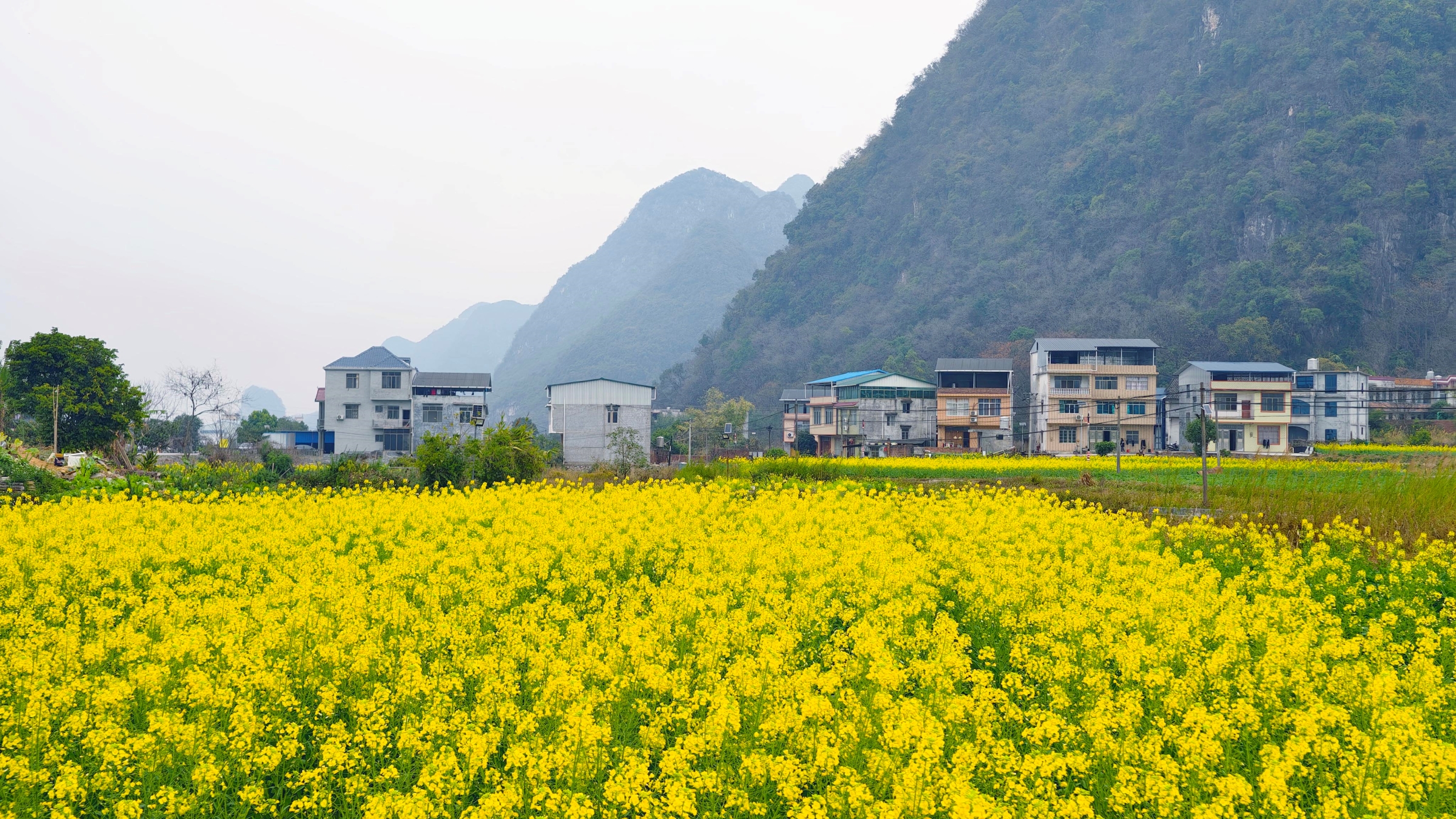融安县暖阳相伴,田间万余亩油菜花竞相绽放。金黄花浪随风摇曳,蜜蜂穿梭花丛采蜜忙,花海与青山村寨相映成趣,处处荡漾着盎然春意。(融安县纪委监委供 谭凯兴/摄)