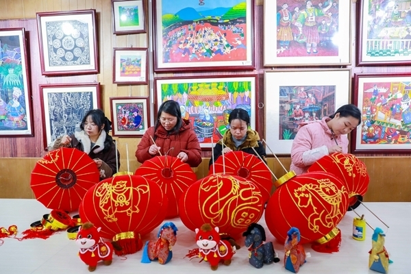 广西壮族自治区三江侗族自治县三江侗画馆内,三江农民画爱好者们手持彩笔,在大红灯笼上精心绘制“福马”图案,画笔起落间,骏马扬蹄、福字绽彩,传统年味与侗乡画韵交融,为新春添上一抹灵动色彩。(广西壮族自治区三江侗族自治县纪委监委供 龚普康 摄 )