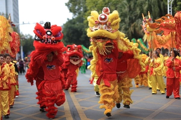广西壮族自治区鹿寨县开展舞龙舞狮、彩调、山歌、民族服装展示等民俗文化巡游活动,让群众沉浸式感受年味,共赴一场喜庆祥和的新春文化盛宴。(广西壮族自治区鹿寨县纪委监委供 肖虹路 摄)