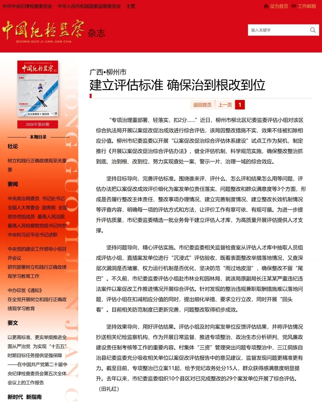 《中国纪检监察》杂志第5期刊发《广西·柳州市 建立评估标准 确保治到根改到位》文章,介绍柳州市开展“以案促改促治综合评估体系建设”试点工作的经验做法。