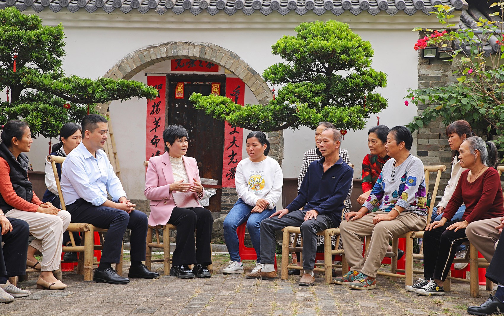 广西勤廉先进个人周霜(左四)和群众共学好家风,同话民族团结