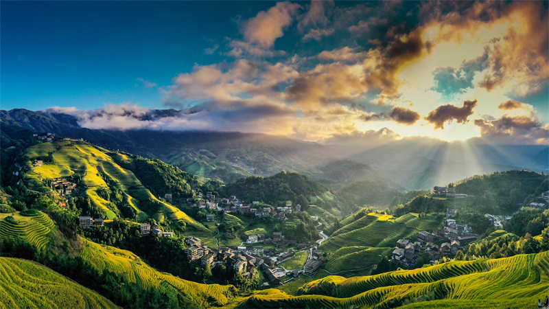 当阳光穿透云层,洒向蜿蜒如绸的金黄梯田,每一道田埂都成了光的琴弦,而镶嵌在山褶皱里的吊脚楼,像散落的音符,在天地间奏响一曲秋日赞歌。(龙胜各族自治县纪委监委供 潘盘辉/摄)