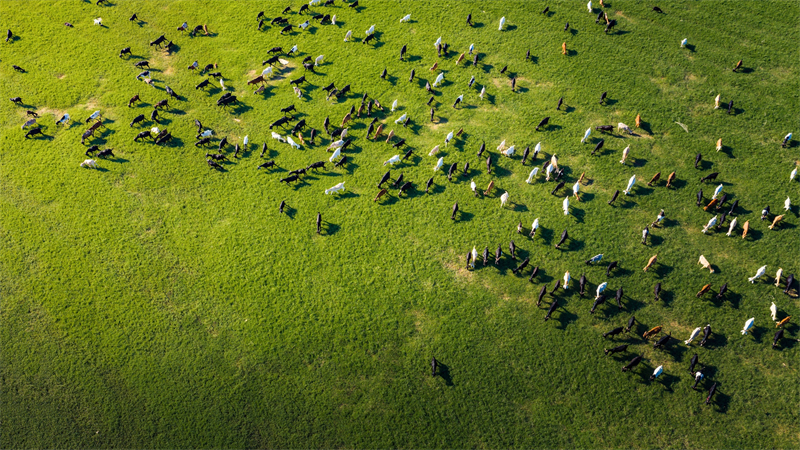 俯瞰永福县金鸡河水库大草原,羊群如打翻的调色盘,在光影里绘就出一幅灵动的乡土牧韵图。(永福县纪委监委供 邱岗诚/摄)