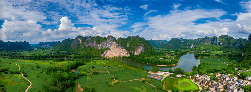 九月秋染大地,蓝天、碧水、山峦、田园相映成趣,环绕着崇左市宁明县古老的花山岩画,尽显壮乡山水的独特韵味和人文底蕴。(宁明县纪委监委供 黄承豹/摄)