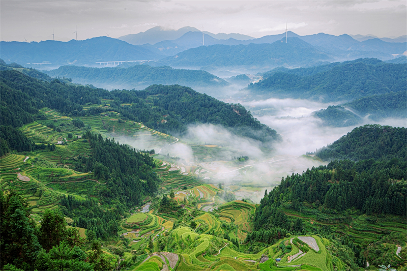 金秋时节,在融水苗族自治县安太乡元宝村,错落有致的梯田、黄绿相间的稻谷与连绵起伏的山峦、随风旋转的风车掩映在云雾中,构成一幅美丽的秋日田园画卷。(柳州市鱼峰区纪委监委 蔡继青/摄)