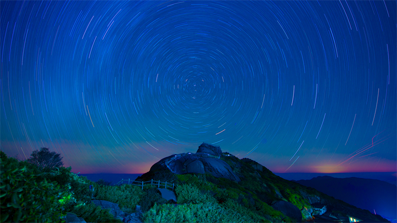夜幕如蓝丝绒倾泻,山顶托举苍穹。星子化萤火,经长曝光绕天极绘光带,似时光年轮。山脚植被覆夜影,远处天色紫粉渐变,星轨冷光与暖调交融,织就宇宙大地共舞的浪漫乐章。(桂林市纪委监委驻桂林投资集团纪检监察组供 阮弸俊/摄)